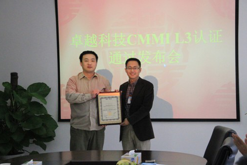 ? 2011年9月21日上午10點(diǎn),在卓越科技二樓會議室舉行的CMMI?3級認(rèn)證通過發(fā)布會上,由美國SEI授權(quán)的主任評估師劉海笑鄭重宣布:經(jīng)過嚴(yán)格的現(xiàn)場審核和評估,卓越科技已經(jīng)達(dá)成了CMMI3級的目標(biāo),成功通過CMMI3級認(rèn)證!
