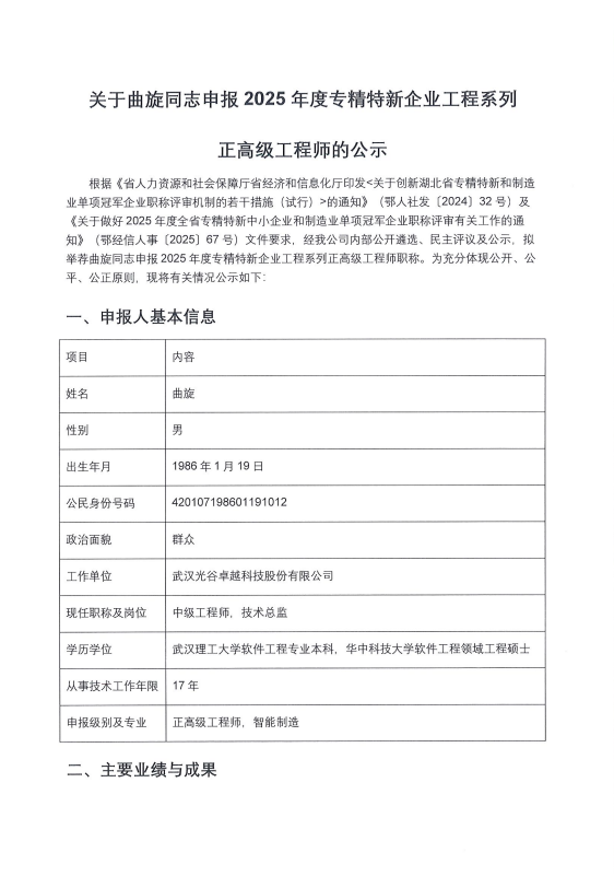 根據(jù)《省人力資源和社會(huì)保障廳省經(jīng)濟(jì)和信息化廳印發(fā)<關(guān)于創(chuàng)新湖北省專精特新和制造業(yè)單項(xiàng)冠軍企業(yè)職稱評(píng)審機(jī)制的若干措施(試行)>的通知》(鄂人社發(fā)〔2024〕32號(hào))及《關(guān)于做好2025年度全省專精特新中小企業(yè)和制造業(yè)單項(xiàng)冠軍企業(yè)職稱評(píng)審有關(guān)工作的通知》(鄂經(jīng)信人事〔2025〕67號(hào))文件要求,經(jīng)我公司內(nèi)部公開遴選、民主評(píng)議及公示,擬舉薦曲旋同志申報(bào)2025年度專精特新企業(yè)工程系列正高級(jí)工程師職稱。為充分體現(xiàn)公開、公平、公正原則,現(xiàn)將有關(guān)情況公示如下: